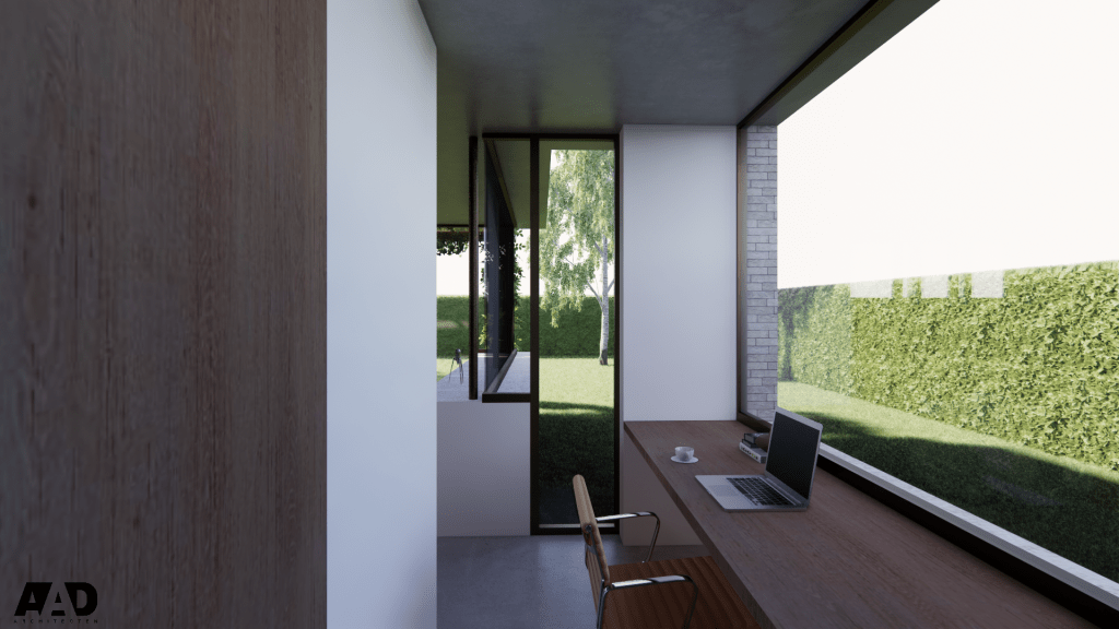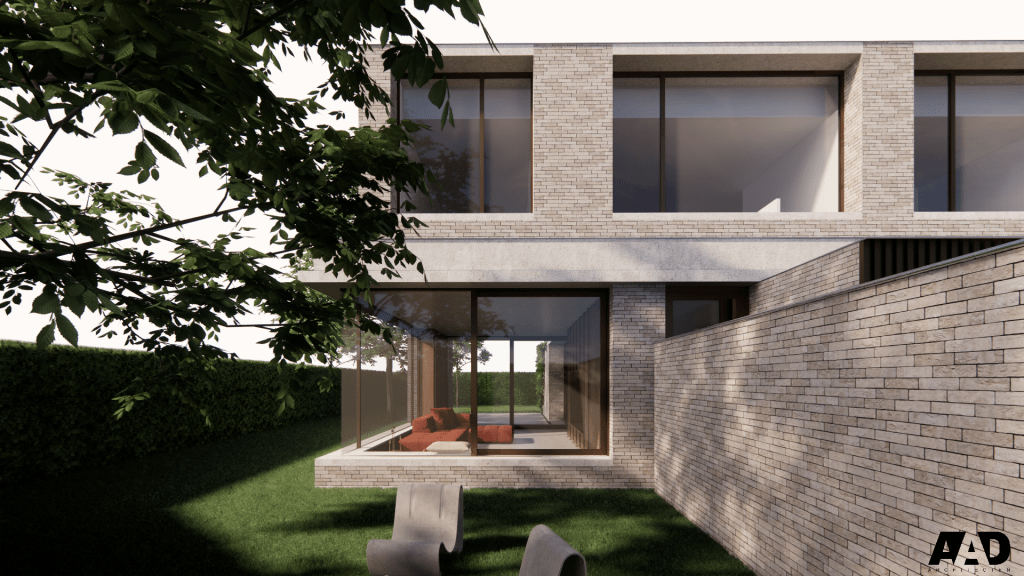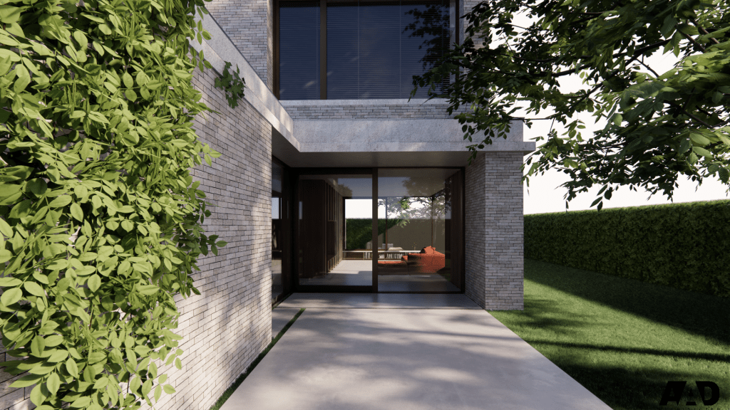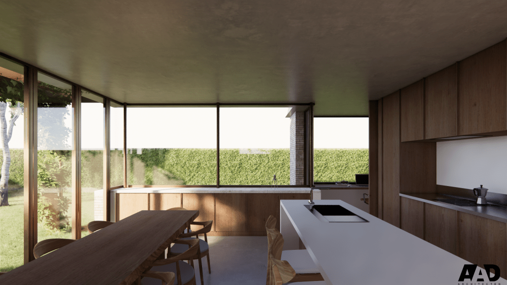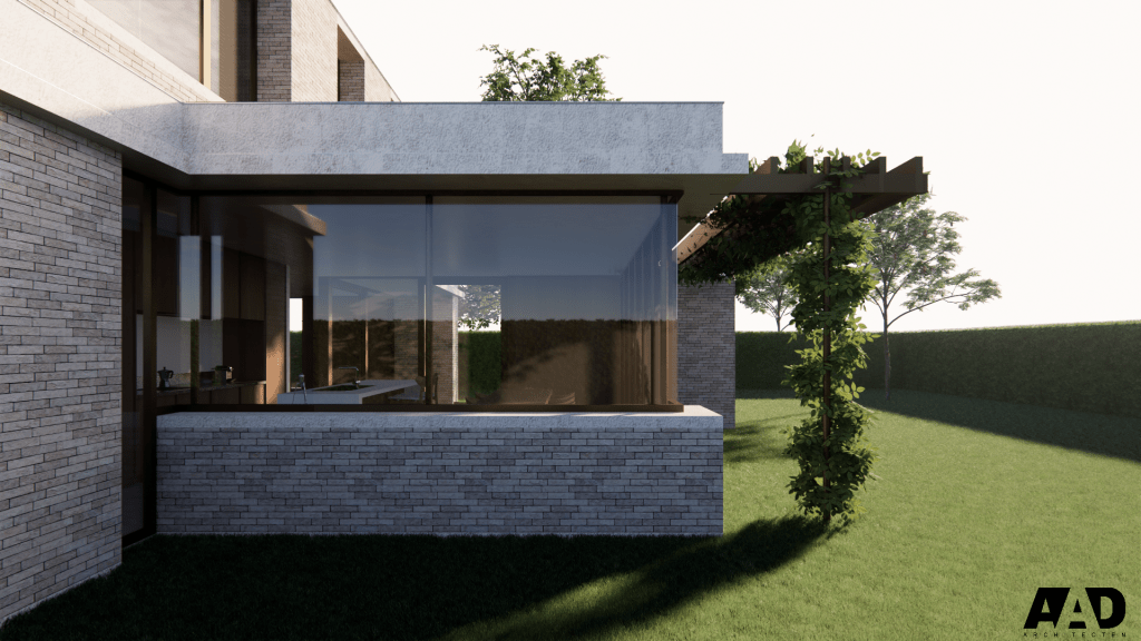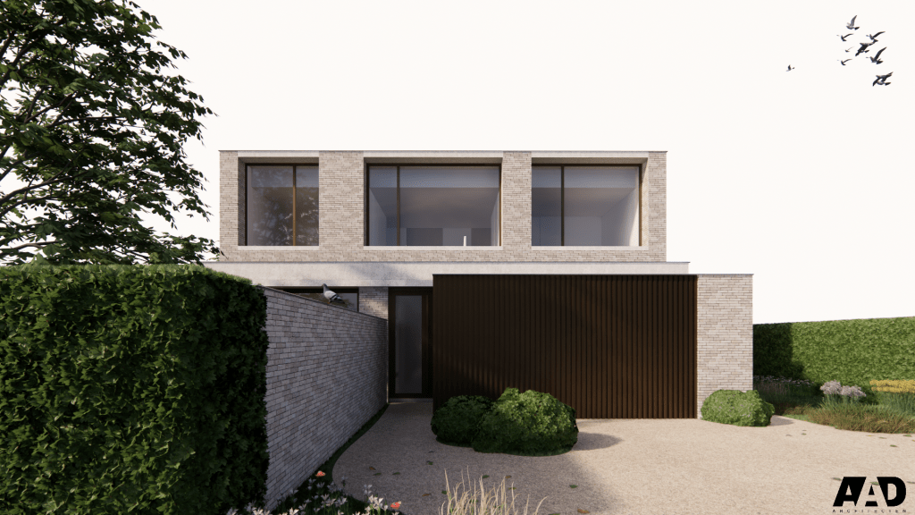De woning integreert in de huidige omgeving en de bestaande aanplanting op het perceel. De keuze van materialen en verhoudingen geven dit huis een tijdloze uitstraling.