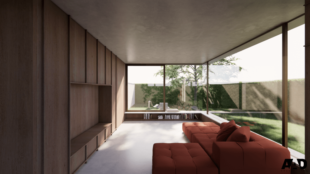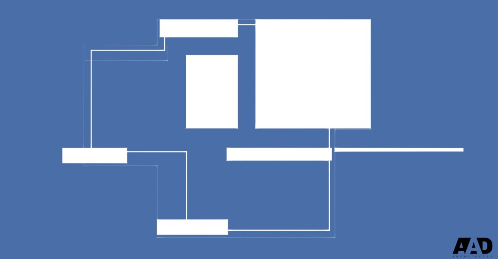 Het concept van deze woning ontstond uit het onderzoek van meerdere volumes te ordenen onder horizontale platen. De volumes zelf bevatten de functionaliteiten. De resterende ruimtes maken plaats voor de scene van het leven.