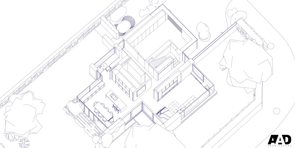 Indelingen en circulaties werden bestudeert volgens het programma en wensen van de bewoners. Eenvoudige isometrieën geven een duidelijk beeld om de organisatie van de woning over te brengen.